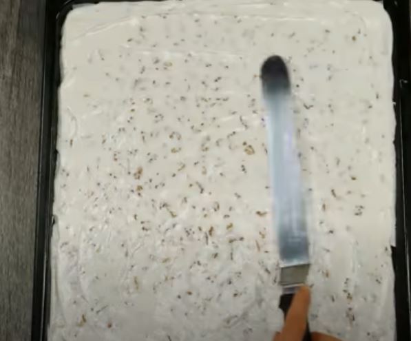 Αδειάζουμε το μείγμα σε ένα ταψί 40χ50 εκ στρωμένο με χαρτί ψησίματος και το απλώνουμε.