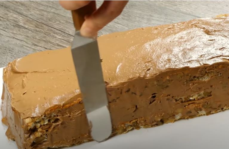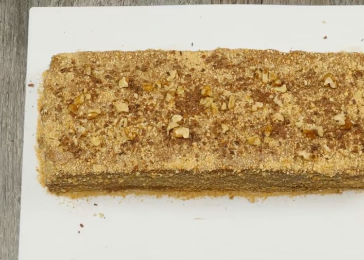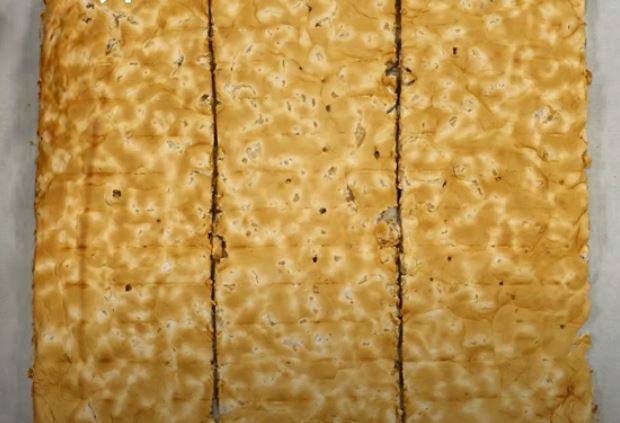 Αφαιρούμε απο το φουρνο και το κόβουμε σε 3 ισες λωρίδες.