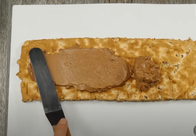 Στρώνουμε την πρώτη λωρίδα με την κρέμα και τοποθετούμε τις άλλες δυο απο πάνω και αλείφουμε με κρέμα