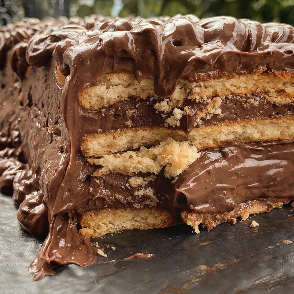 μια σειρά από μπισκότα, μια σειρά κρέμα σοκολάτας και για άλλη μπισκότα και μια φορά κρεμα σοκολάταςκαι τελειώστε με μια στρώση με μπισκότα. Σκεπάζουμε με μεμβρανη και αφήνουμε όλη τη νύχτα στο ψυγείο για να σφίξει.
