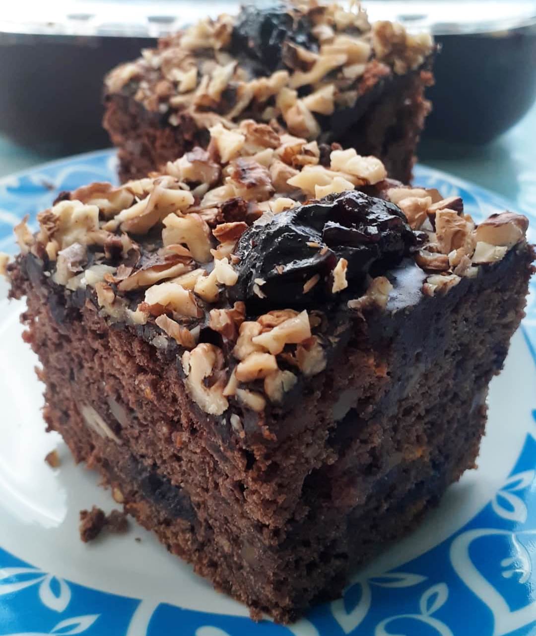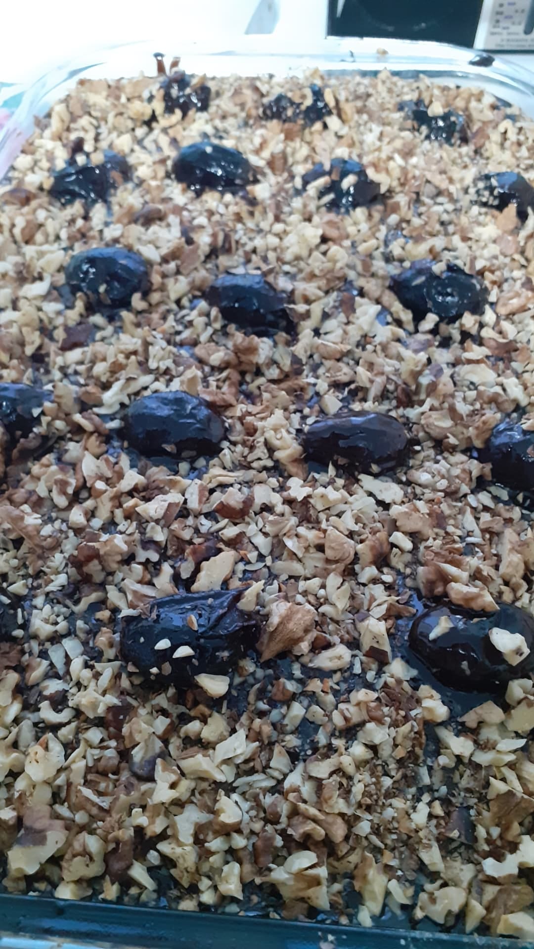 Όταν είναι σε θερμοκρασία δωματίου, καλύψτε το πάνω μέρος του κέικ. Διακοσμήστε με δαμάσκηνα και ξηρούς καρπούς. Καλή όρεξη!