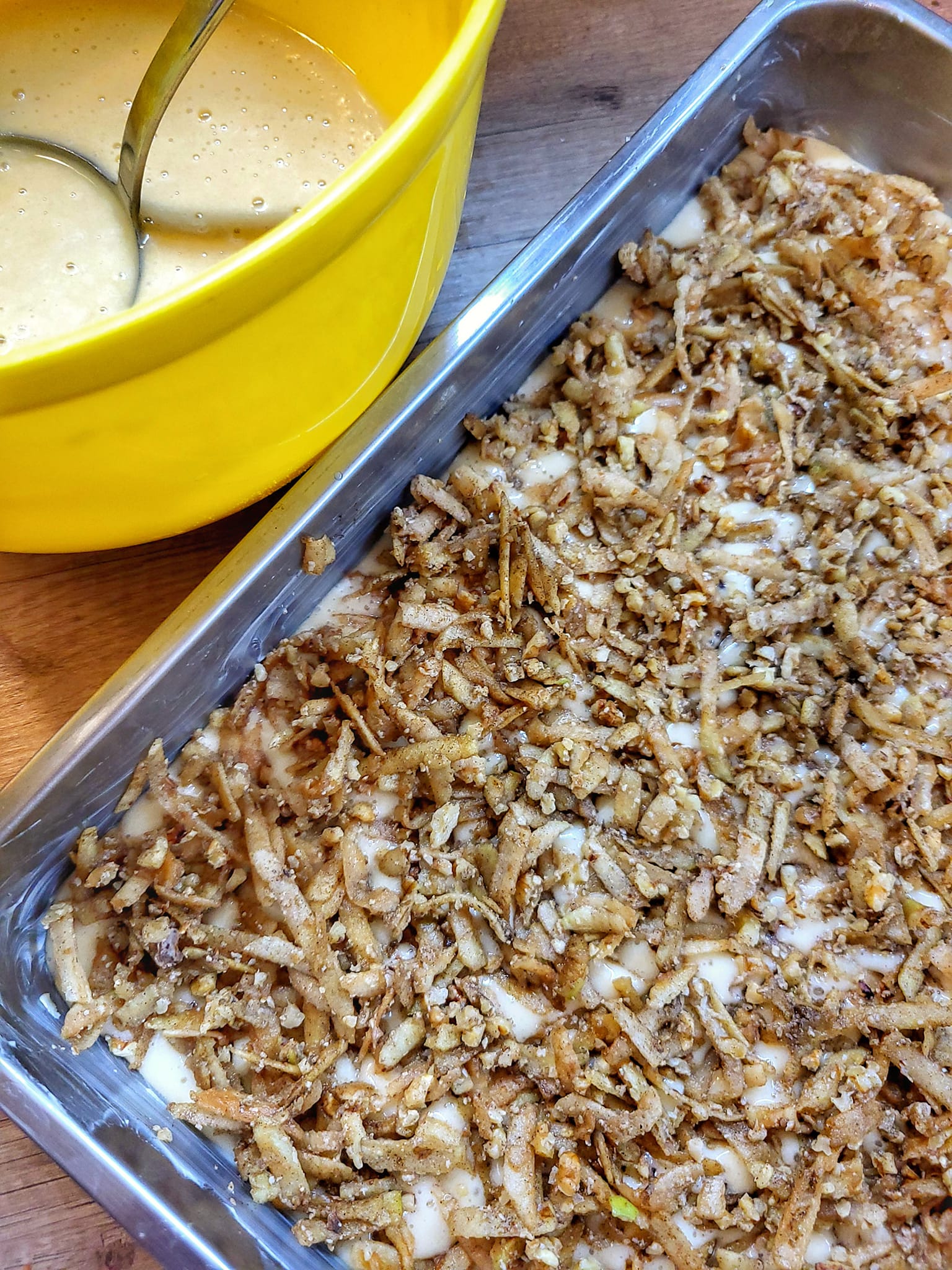 Περιχύνουμε με το υπόλοιπο μείγμα του κέικ και λειαίνουμε με ένα κουτάλι.