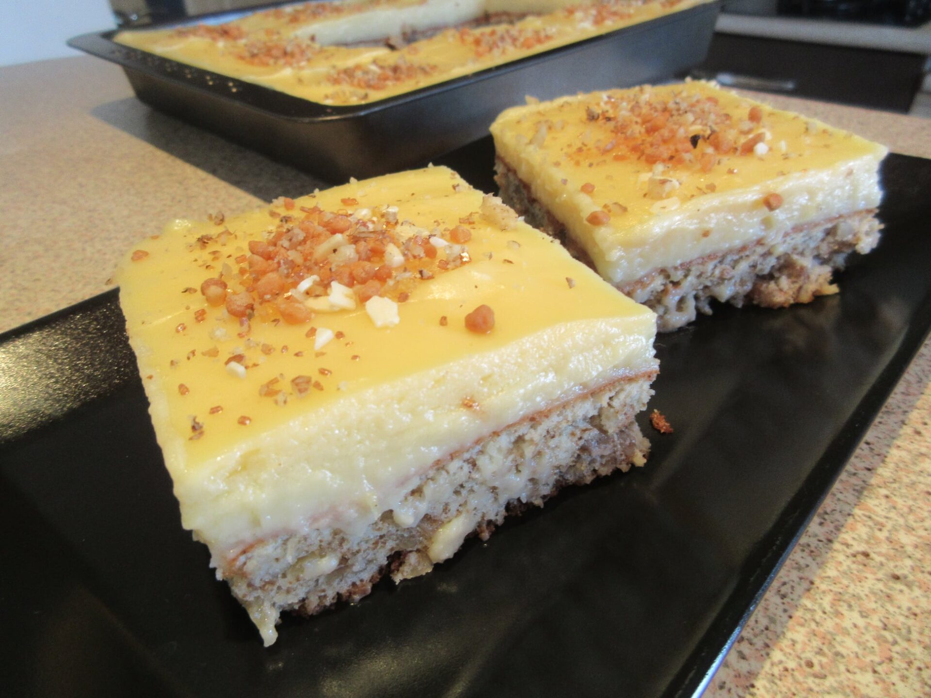 Όταν και το κέικ και η κρέμα έχουν κρυώσει στην αφή, απλώστε την κρέμα από πάνω και πασπαλίζω από πάνω καρύδια, λευκή σοκολάτα και χρωματιστή ζάχαρη.