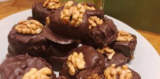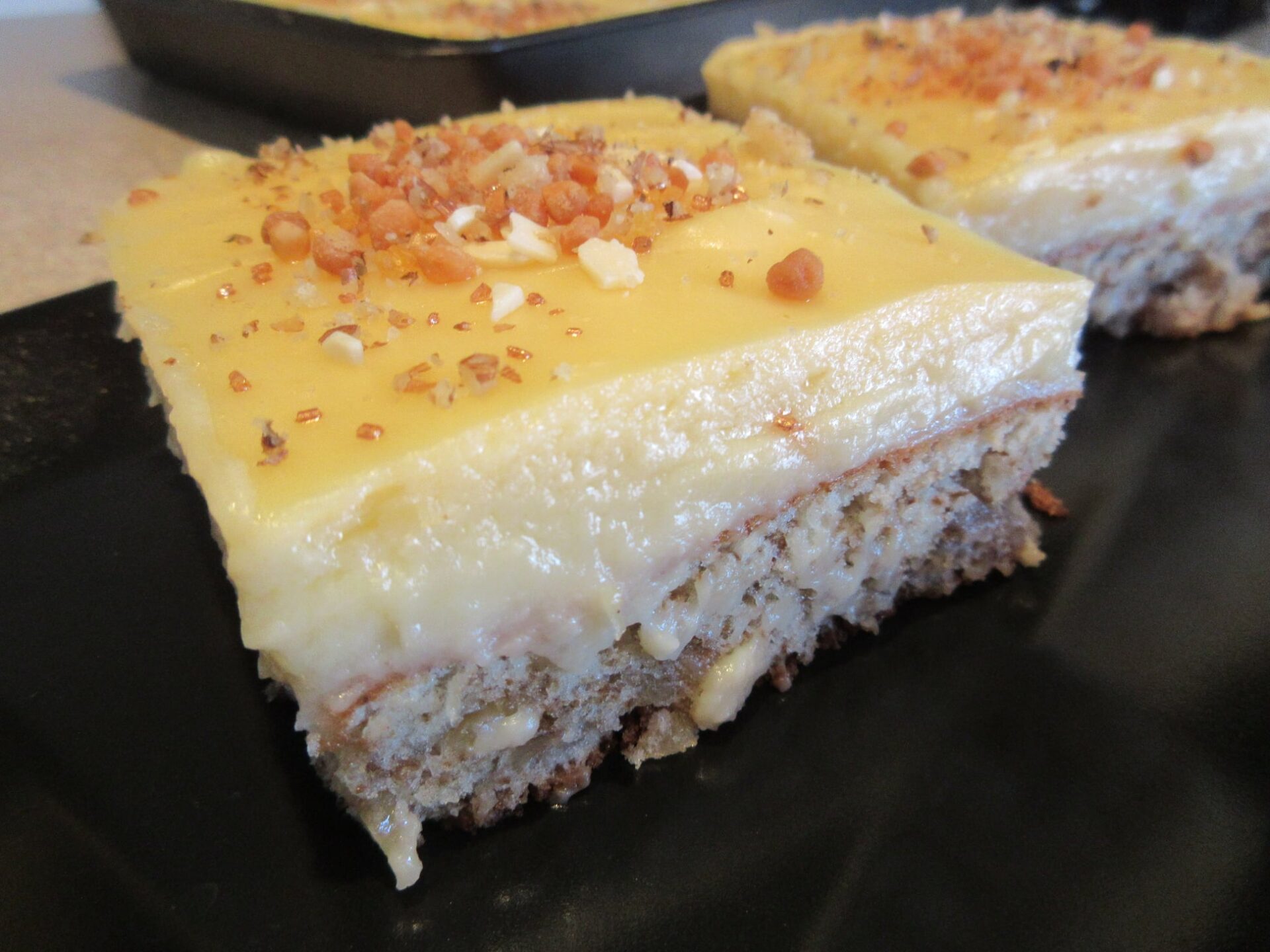 Όταν και το κέικ και η κρέμα έχουν κρυώσει στην αφή, απλώστε την κρέμα από πάνω και πασπαλίζω από πάνω καρύδια, λευκή σοκολάτα και χρωματιστή ζάχαρη.