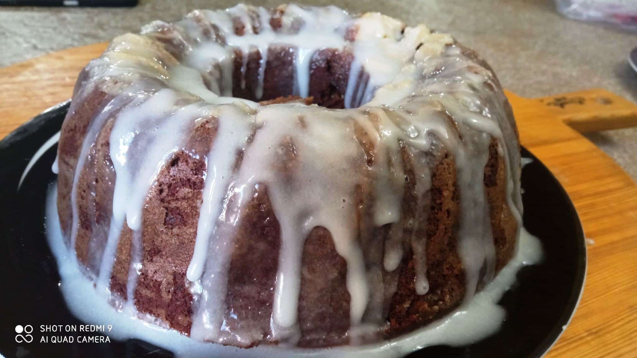 Ψήνουμε το κέικ για περίπου 55 με 60 λεπτά ανάλογα με τον φούρνο μας Ελέγχουμε αν είναι έτοιμο τρυπώντας το κέντρο με ένα μαχαίρι το οποίο πρέπει να βγαίνει καθαρό Αφού το βγάλουμε το αφήνουμε να κρυώσει καλά μέσα στη φόρμα πριν το ξεφορμάρουμε Τέλος ετοιμάζουμε ένα απλό γλάσο διαλύοντας άχνη ζάχαρη σε ελάχιστο γάλα και περιχύνουμε το κέικ μας για μια πιο εντυπωσιακή εμφάνιση