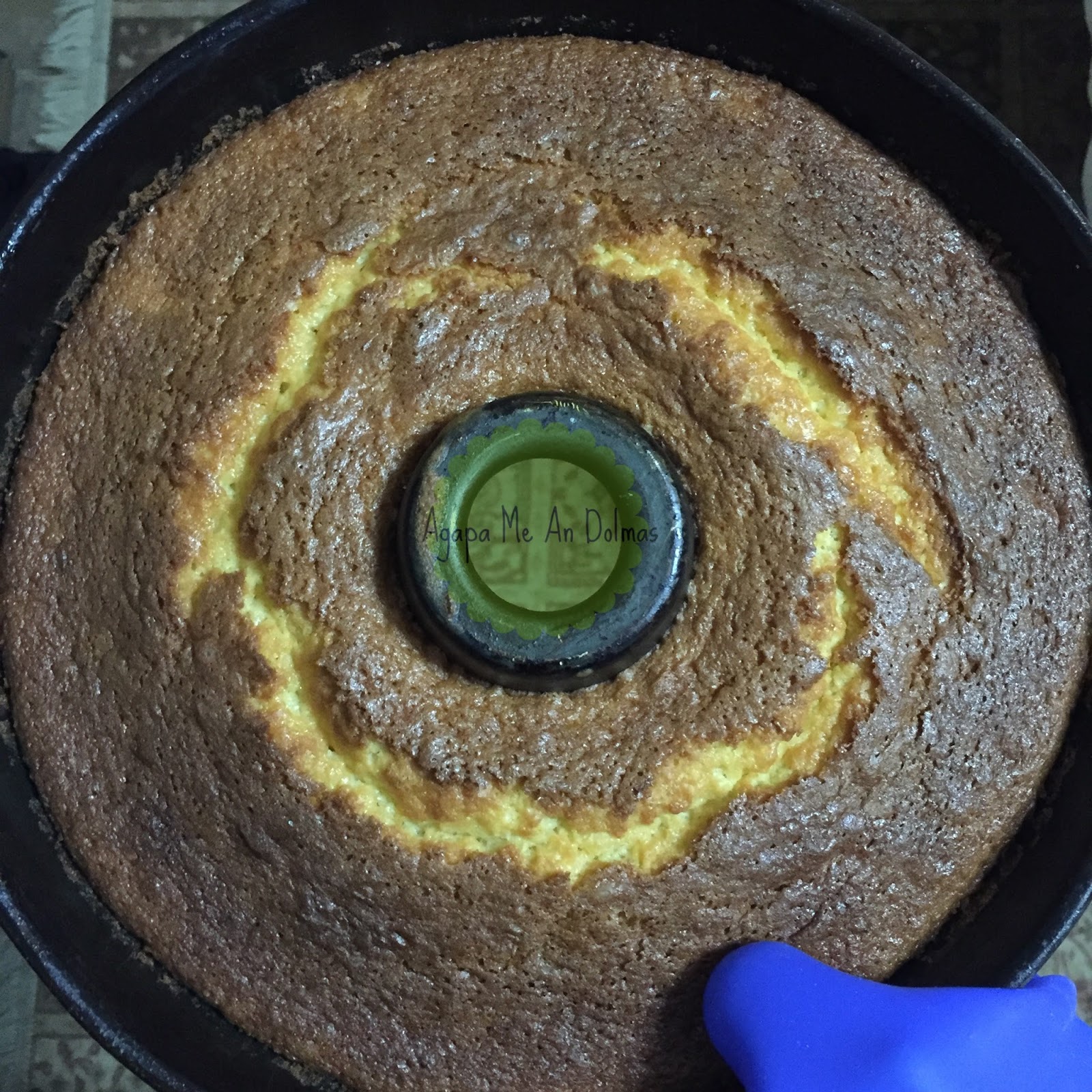 5. ξεφορμάρουμε μετά απο 5 λεπτά. Το κέικ αυτό μοιάζει σα σιροπιαστό λόγω των πορτοκαλιών.