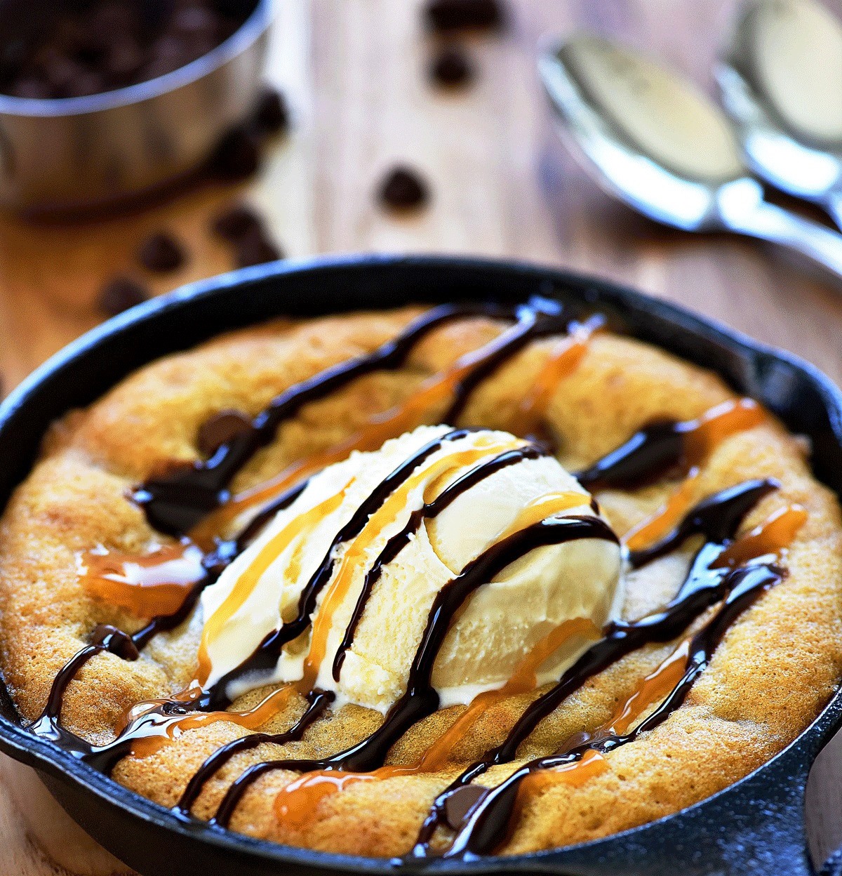 Σερβίρετε με μια μπάλα παγωτού βανίλιας και σιρόπι καραμέλας και σοκολάτας.