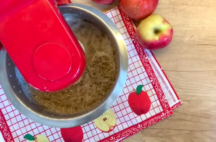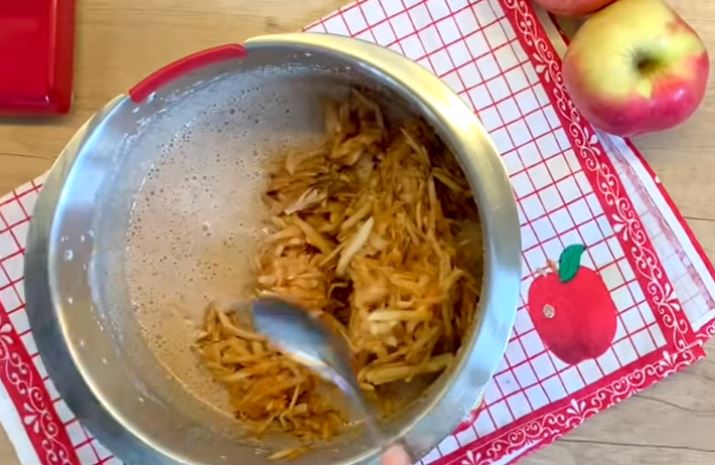Βγάζουμε το μπολ απο το μιξερ και αδειάζουμε τα μήλα μέσα και ανακατεύουμε με μια μαριζ