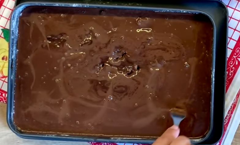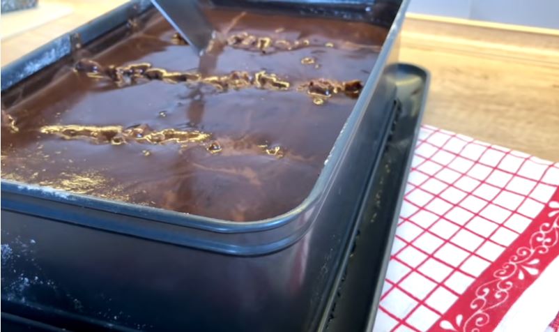 και να πήξει. Τρυπάμε το ζεστό κέικ με ένα πιρούνι και ρίχνουμε πάνω από τη σοκολάτα και το ξανα τρυπάμε.