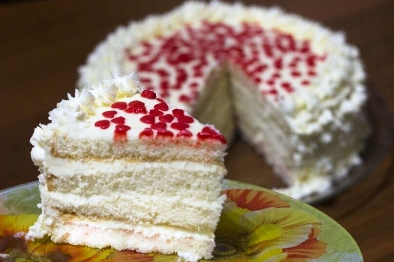 6. Κόφτε το κέικ σε φέτες. Στρώνουμε τα κέικ με κρέμα, τα βάζουμε στο ψυγείο για 20 λεπτά. Διακοσμώ.