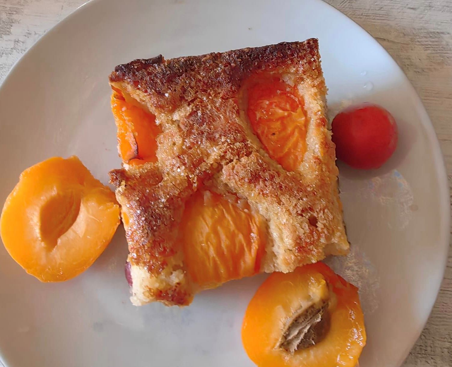 Αραδιάζουμε από πάνω φέτες βερίκοκου και πασπαλίζουμε με καστανή ζάχαρη για μια μυρωδάτη κρούστα καραμέλας.