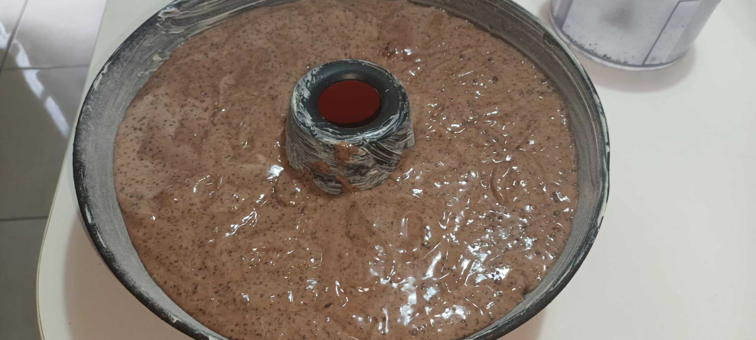 4. Αδειάζω το μείγμα σε μια βουτυρωμένη και αλευρωμένη φόρμα με διάμετρο 28 εκατοστά. Ψήνω σε προθερμασμένο φούρνο στους 180°C, στις αντιστάσεις, για περίπου 50 με 55 λεπτά, ανάλογα με τον φούρνο μου.