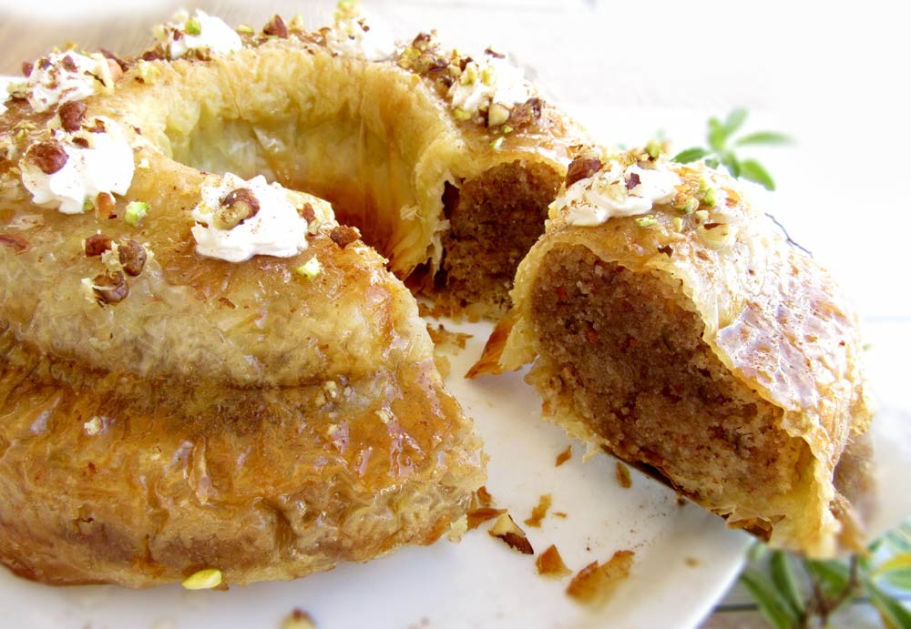 Το Κέικ με φύλλο και γέμιση Μπακλαβά είναι ένα γλυκό που παντρεύει την παράδοση με τη μοντέρνα ζαχαροπλαστική. Η βάση του είναι ένα αφράτο κέικ με καρύδια και μπαχαρικά, το οποίο καλύπτεται από τραγανό φύλλο κρούστας, όπως ακριβώς ο μπακλαβάς. Εγώ το σερβίρω όταν θέλω να εντυπωσιάσω τους καλεσμένους μου, και είναι πάντα μία σίγουρη επιτυχία.