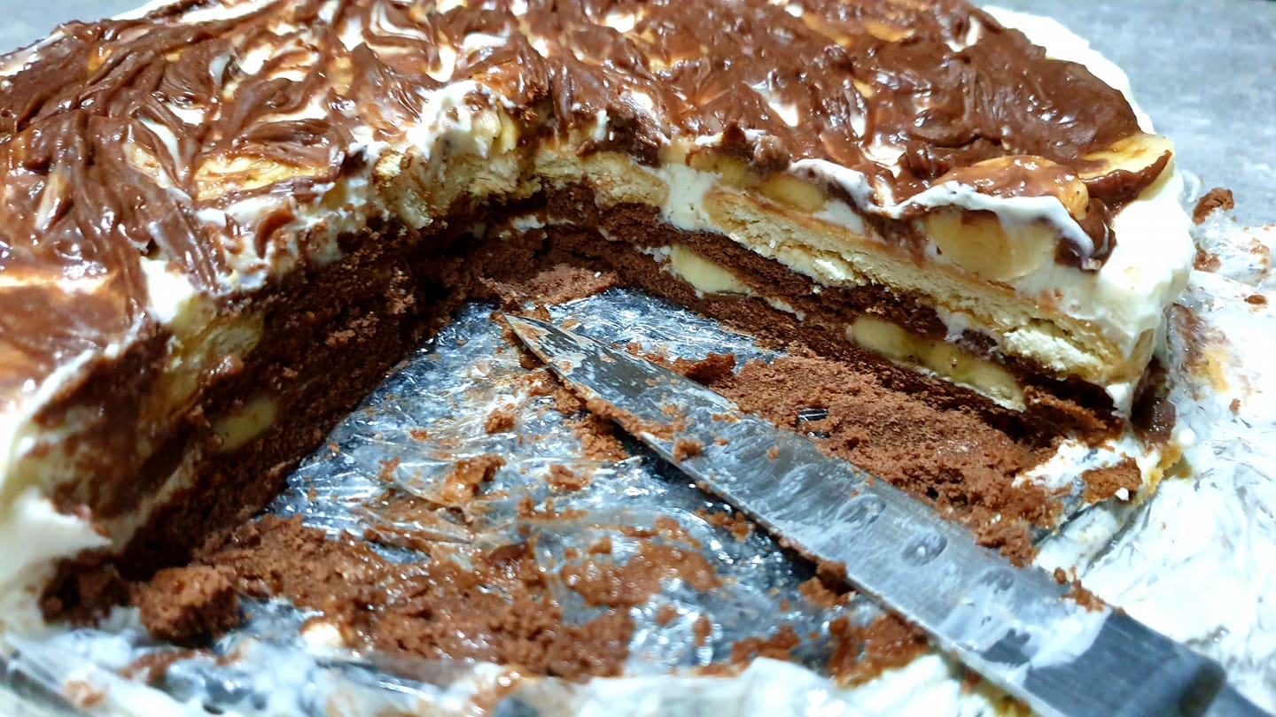 Επαναλάβετε τη διάταξη μέχρι να τελειώσουν τα μπισκότα (έκανα 3 σειρές) και ρίχνω την υπόλοιπη κρέμα στην κορυφή και διακοσμημένη με φέτες μπανάνας. Σε κατάλληλο μπολ, λιώστε τη σοκολάτα σε μπεν ή φούρνο μικροκυμάτων και ρίξτε πάνω από το κέικ. Αφήστε το στο ψυγείο για λίγες ώρες και στη συνέχεια απολαύστε την εκπληκτική γεύση του.