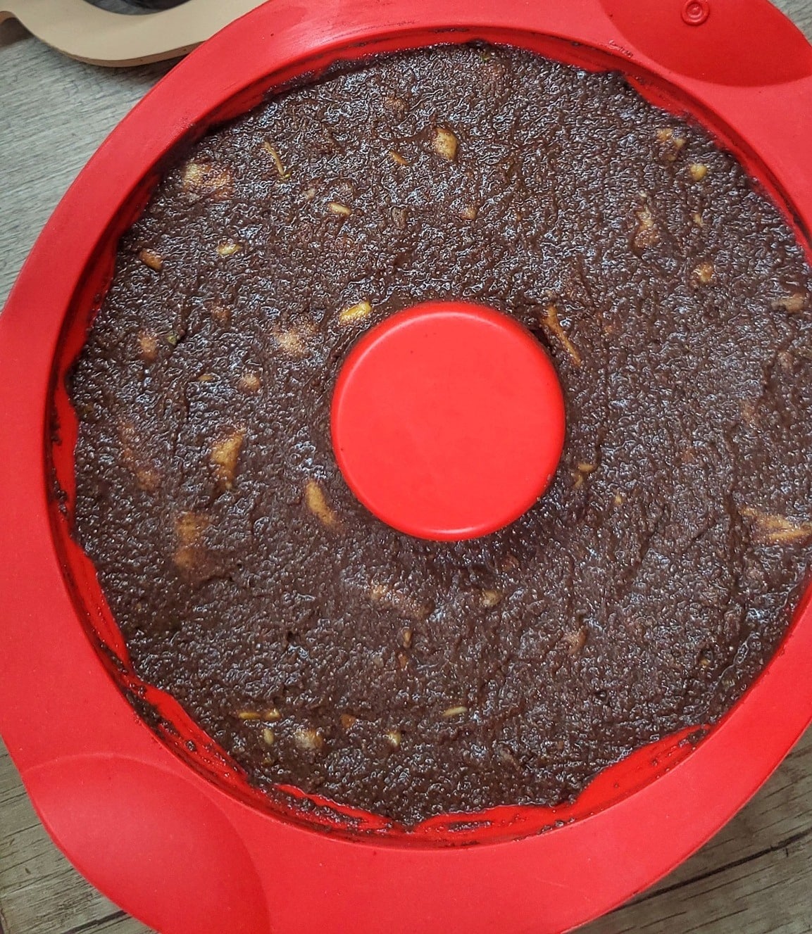 Ανακατεύω και ρίχνω το μείγμα. σε φόρμα για κέικ σιλικόνης.
