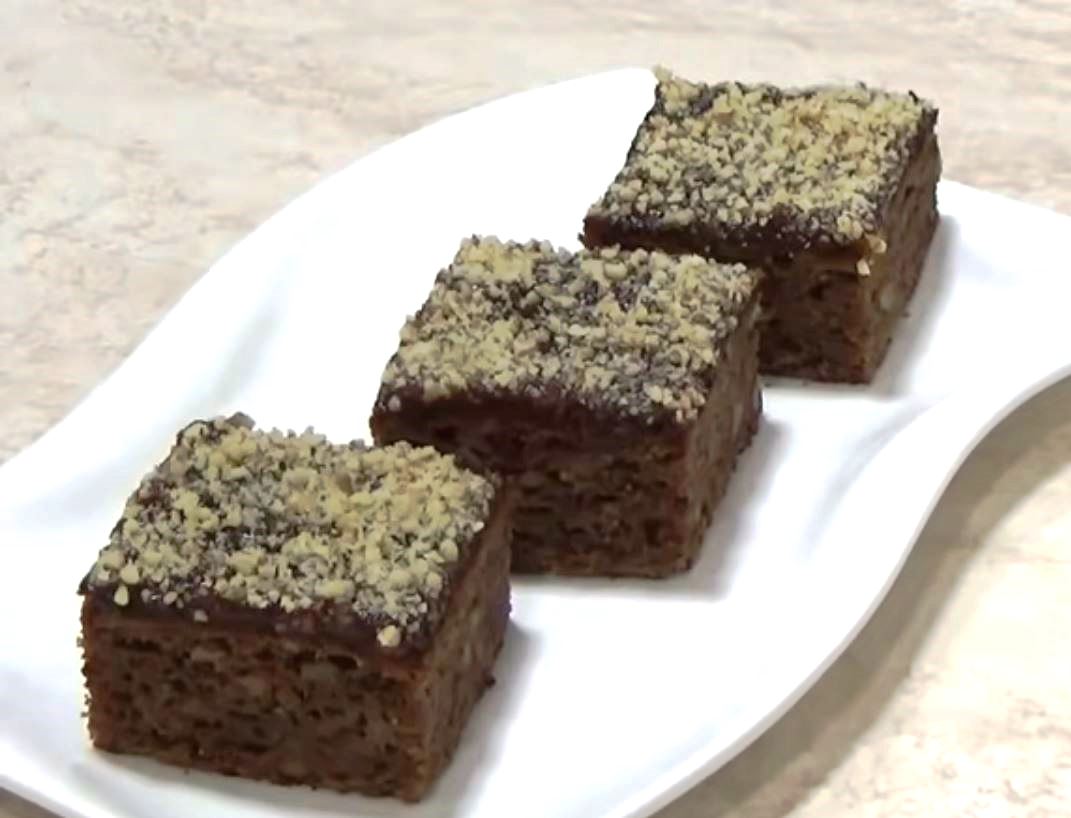 Καλύψτε το ζεστό κέικ με μαρμελάδα και πασπαλίστε με αλεσμένα καρύδια.