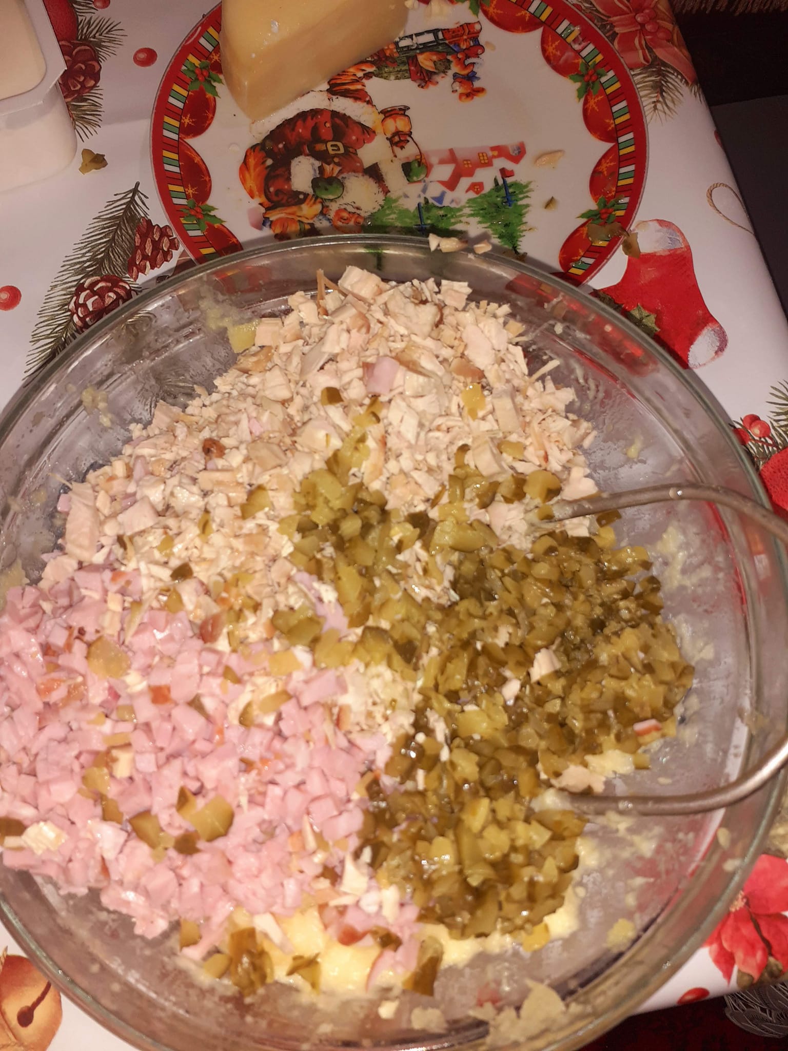 Τα τουρσιά, το καπνιστό κρέας και το φιλέτο κοτόπουλου κόβονται σε μικρά κομμάτια