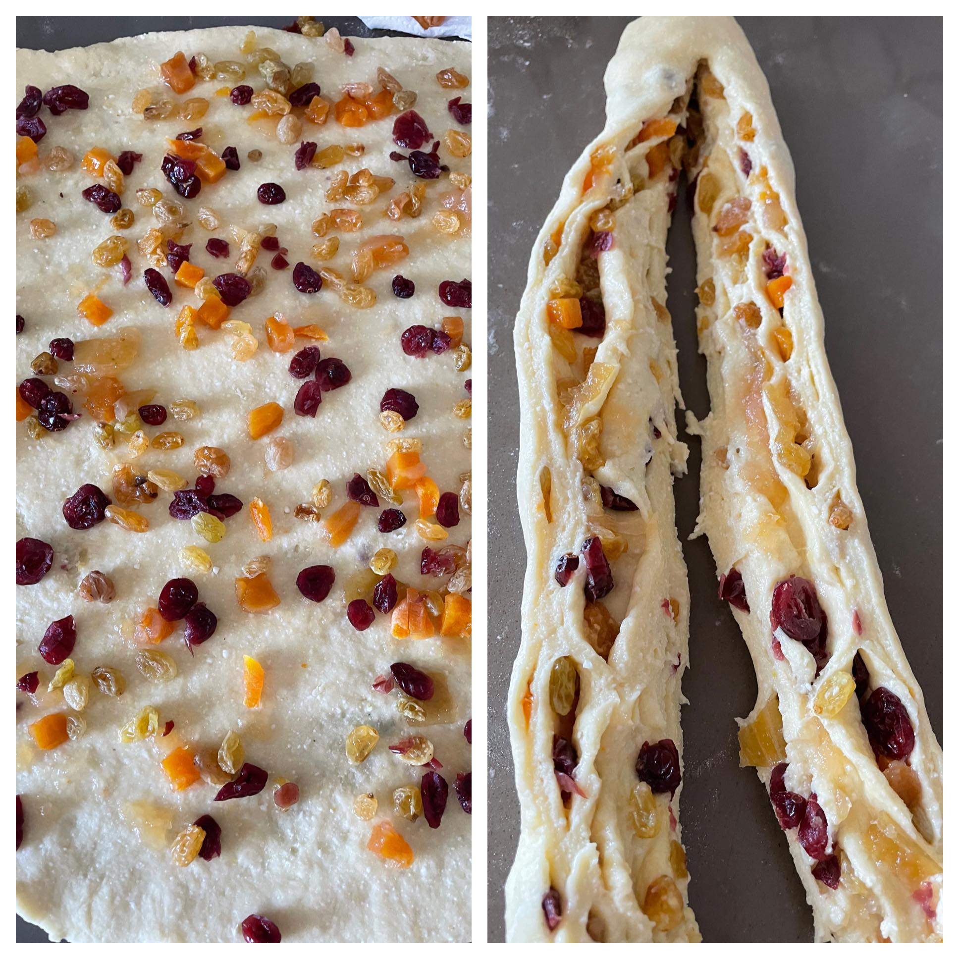 με αποξηραμένα φρούτα, το τυλίγουμε, το κόβουμε στη μέση όπως ατην φωτο, σταματώντας 1 εκ. από την κορυφή, πλέκουμε τις φέτες προς τα πάνω.