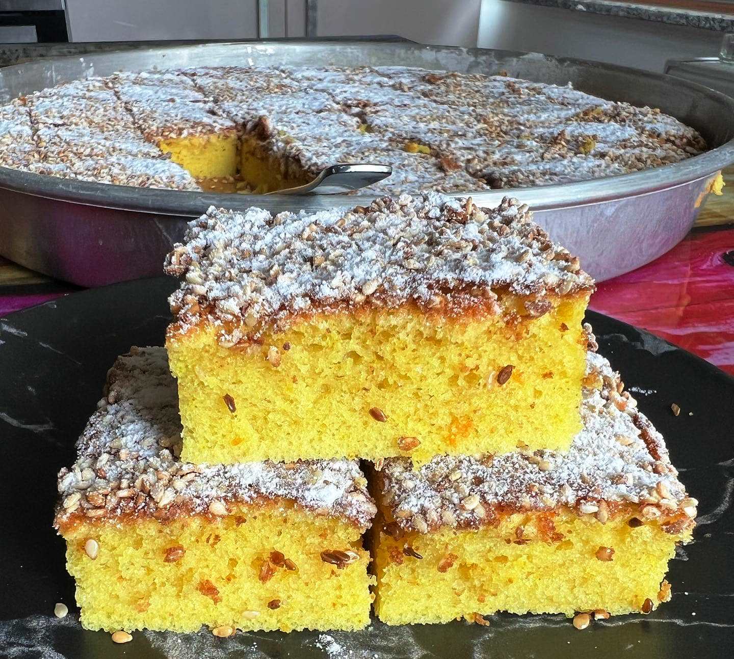 Δείτε τι χρώμα είναι, Ζωντανό πορτοκάλι, κουρκουμάς και αυγά . Το χρώμα, το άρωμα, η γεύση και η απαλότητά του είναι απιστευτη και δεν μπορώ να πω ότι μου αρέσει μόνο ένα πράγμα σε αυτό το κέικ: