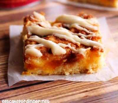 Για την επικάλυψη  Κανέλας: Σε ένα μικρό μπολ, συνδυάστε την καστανη ζάχαρη, αλεύρι, κανέλα και αλάτι. Προσθέστε το κρύο βούτυρο και χρησιμοποιώντας τα καθαρά χέρια σας, τρίψτε τα όλα μαζί τα ξηρά συστατικά με το βούτυρο. Πασπαλίστε το πάνω από κέικ. Ψήνετε για 33-35 λεπτά ή μέχρι να βγει καθαρή μια οδοντογλυφίδα από το κέντρο του κεικ και βάλτε το στο ψυγείο να κρυώσει εντελώς.