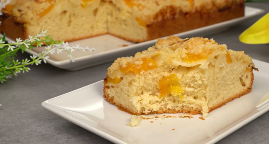 Σε ένα μπλέντερ χτυπάμε τη ζάχαρη το αλεύρι και το βούτυρο έως ότου πάρουμε ένα μείγμα σαν βρεγμένη άμμο το τριμμένο αυτό μείγμα το απλώνουμε πάνω από τα ροδάκινα ψήνουμε για 35 λεπτά στους 190 βαθμούς σε προθερμασμένο φούρνο και το κέικ μας είναι έτοιμο