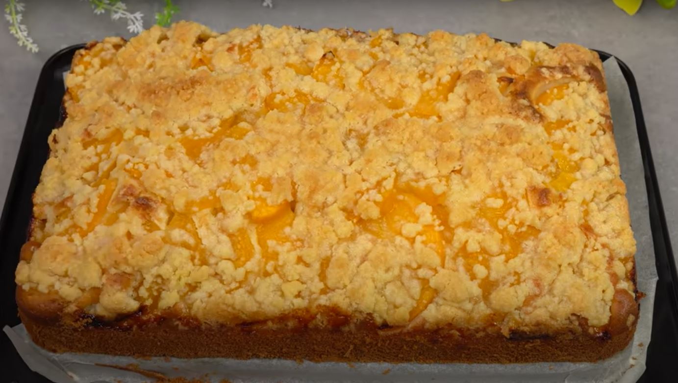Σε ένα μπλέντερ χτυπάμε τη ζάχαρη το αλεύρι και το βούτυρο έως ότου πάρουμε ένα μείγμα σαν βρεγμένη άμμο το τριμμένο αυτό μείγμα το απλώνουμε πάνω από τα ροδάκινα ψήνουμε για 35 λεπτά στους 190 βαθμούς σε προθερμασμένο φούρνο και το κέικ μας είναι έτοιμο