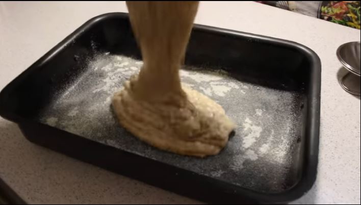 Βουτυρώνουμε το ταψάκι μας το αλευρώνουμε και ρίχνουμε το μείγμα μας.