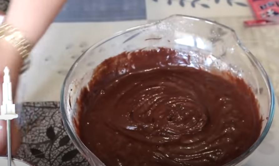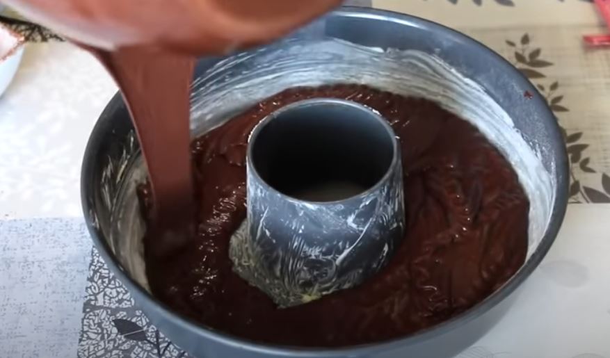 Ρίχνουμε κοσκινισμένο το αλεύρι μαζί με το κακάο και το μπέκιν. Συνεχίζουμε το χτύπημα και προσθέτουμε λίγο λίγο το γάλα.