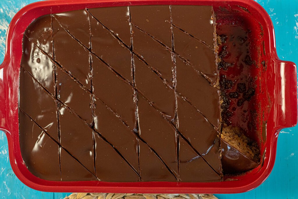Μόλις ολοκληρωθεί το ψήσιμο του κέικ, αφαιρέστε το από το φούρνο και ελενξετο το με μια οδοντογλυφίδα. Ρίχνουμε όλο το κρύο σιρόπι μελιού πάνω στο κέικ και το αφήνουμε στην άκρη σε θερμοκρασία δωματίου, ώστε να απορροφηθεί όλο το σιρόπι. Περίπου μια ώρα.