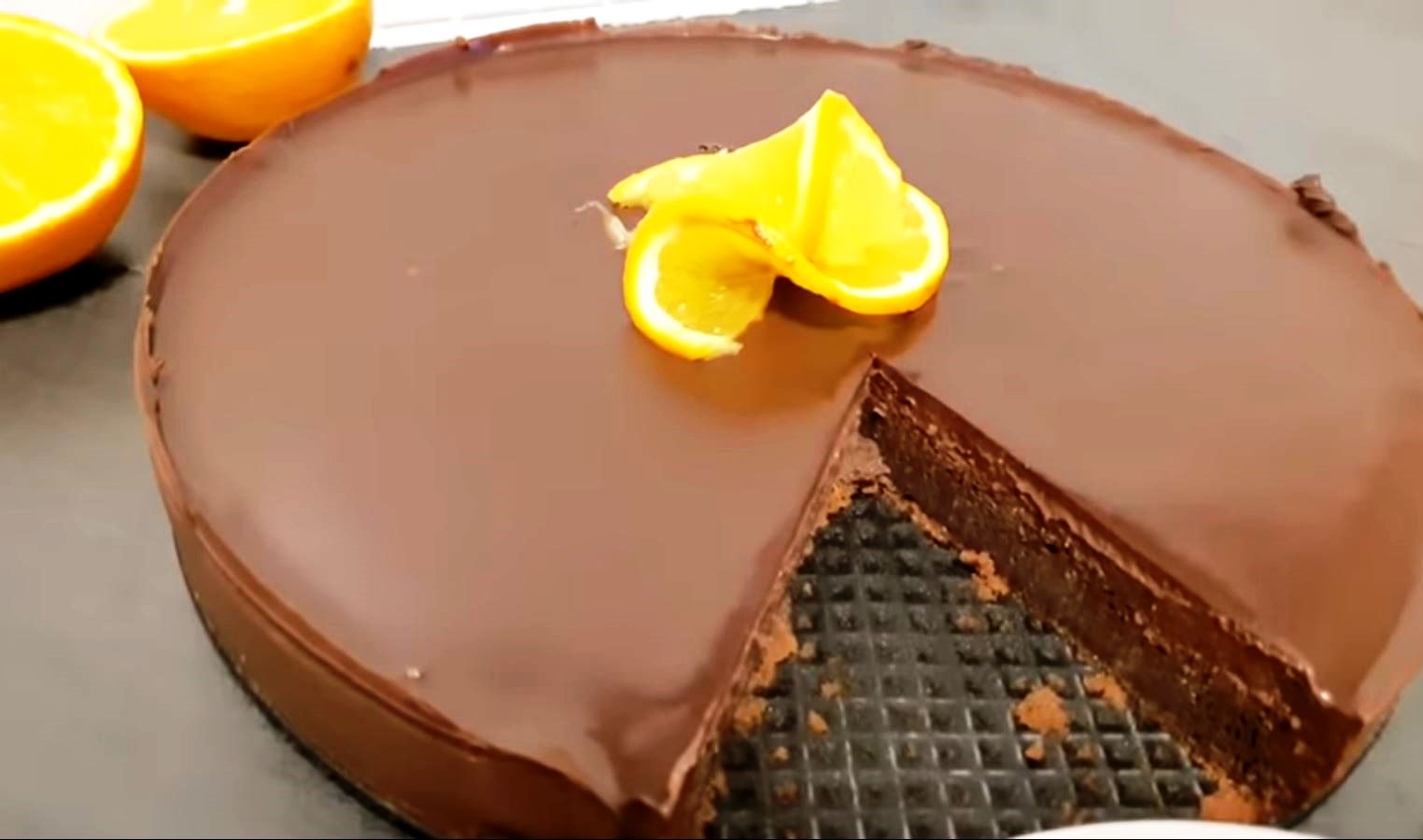 Σε μία κατσαρόλα σε μέτρια φωτιά ρίχνουμε την κρέμα γάλακτος και την σοκολάτα και ανακατεύουμε μέχρι να λιώσει και να πάρουμε ένα σοκολατένιο γλάσο. Στο τέλος ανακατεύουμε το ξύσμα πορτοκαλιού και αδειάζουμε όλο το γλάσο πάνω από την βάση του κεικ, και το βάζουμε στο ψυγείο για τέσσερις έως έξι ώρες. Μόλις το βγάλουμε από το ψυγείο το χαλαρώνουμε γύρω-γύρω με ένα μαχαίρι και αφαιρούμε το τσερκι