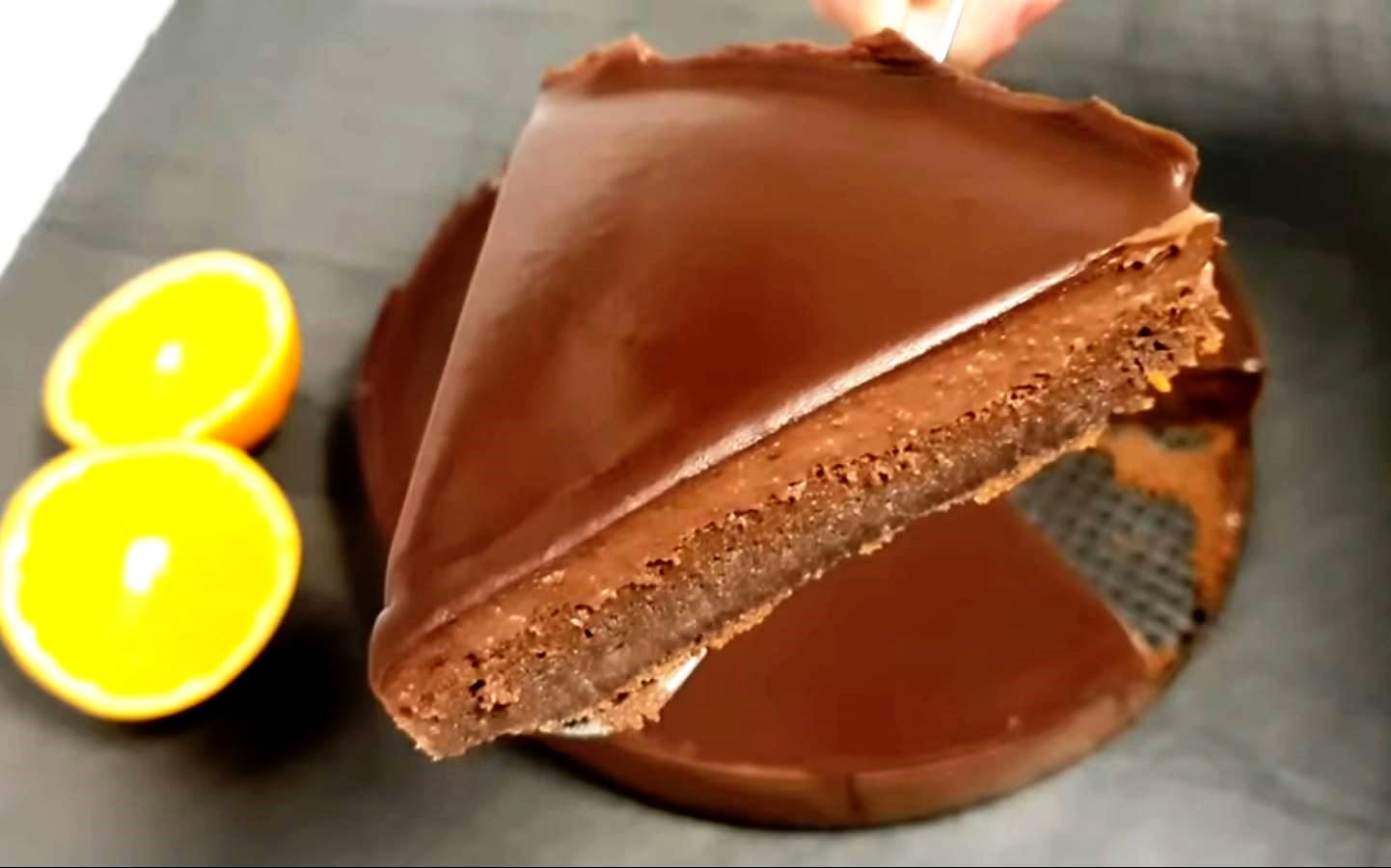 Σε μία κατσαρόλα σε μέτρια φωτιά ρίχνουμε την κρέμα γάλακτος και την σοκολάτα και ανακατεύουμε μέχρι να λιώσει και να πάρουμε ένα σοκολατένιο γλάσο. Στο τέλος ανακατεύουμε το ξύσμα πορτοκαλιού και αδειάζουμε όλο το γλάσο πάνω από την βάση του κεικ, και το βάζουμε στο ψυγείο για τέσσερις έως έξι ώρες. Μόλις το βγάλουμε από το ψυγείο το χαλαρώνουμε γύρω-γύρω με ένα μαχαίρι και αφαιρούμε το τσερκι