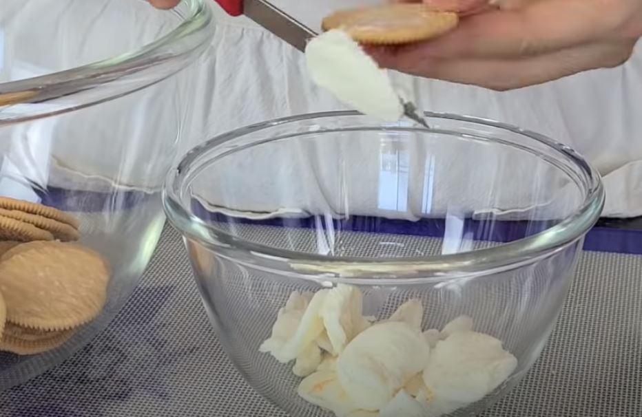 Βγάλτε με ένα μαχαίρι την κρέμα από τα μπισκότα μέσα σε ένα μπολ.