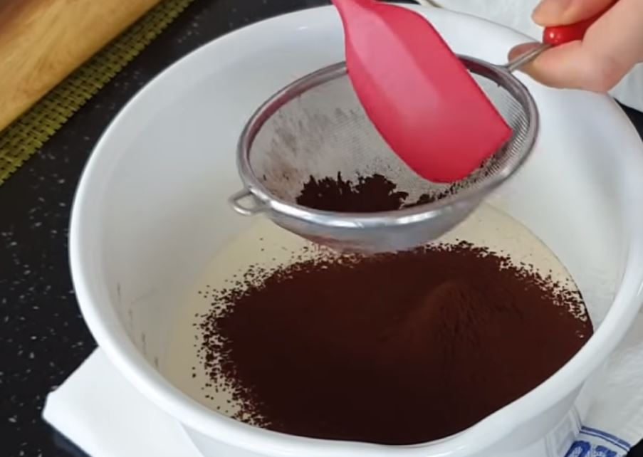 Σε ένα κατσαρολάκι ριξτε την κρέμα γάλακτος (όχι όλη) (Α) και κοσκινίστε τη σκόνη κακάου μέσα και ανακατέψτε. Προσθέστε και την υπόλοιπη κρέμα