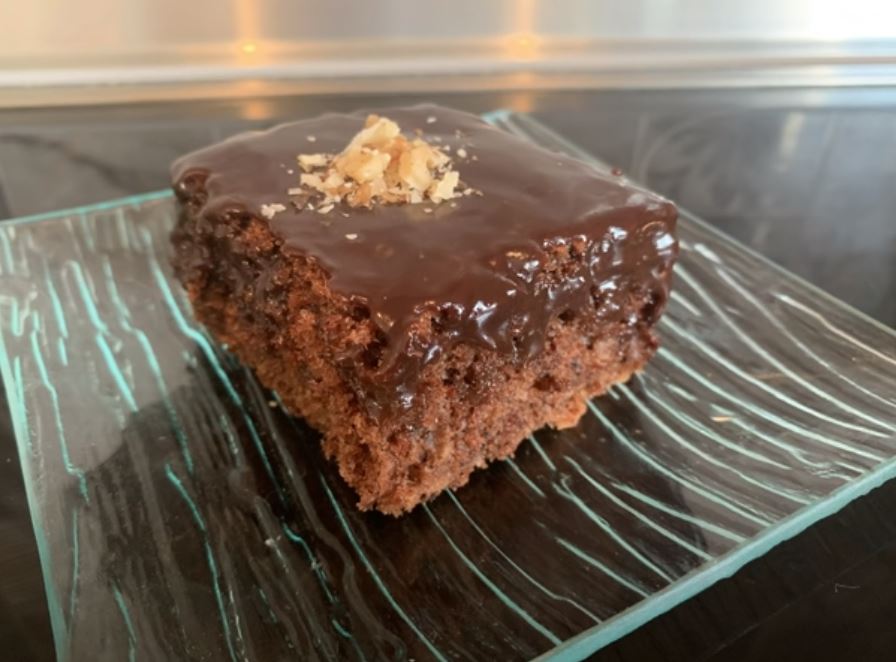 Βγάζουμε από το φούρνο το κέικ ελέγχουμε με την μέθοδο της οδοντογλυφίδας εάν είναι έτοιμο και αφού αφήσουμε την γκαναζ 5 λεπτα να κρυώσει την απλώνουμε πάνω από κέικ μας. Κόβουμε σε κομμάτια και πασπαλίζουμε κάθε κομμάτι με τριμμένο καρύδι και σερβίρουμε