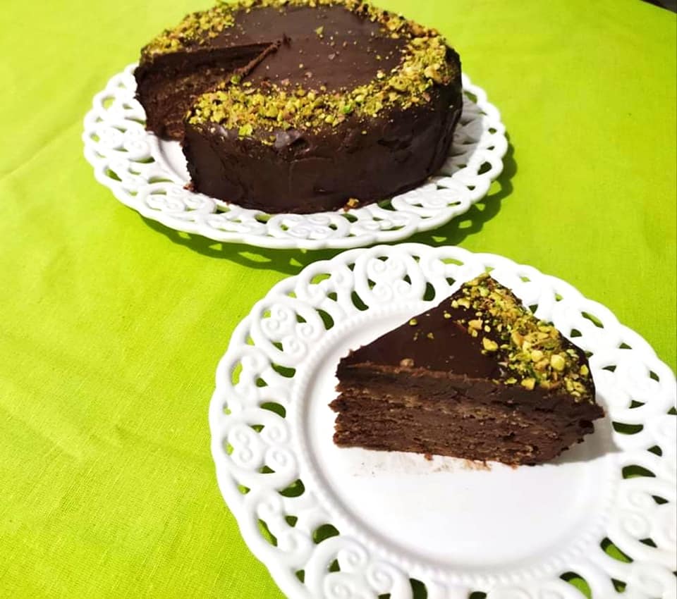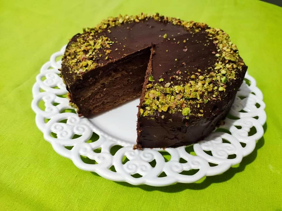 Γκανάς σοκολάτας: Σε κατάλληλο δοχείο σε μπεν μαρι βάζουμε το γάλα (κρέμα γάλακτος) και τη σπασμένη σοκολάτα, προσθέτουμε 1 κουταλιά λάδι για λάμψη. Περιχύνουμε στη μέση του κέικ και με τη βοήθεια μιας σπάτουλας κέικ απλώνουμε σε όλο το κέικ. Πριν το σερβίρετε, πασπαλίστε με φιστίκια φρεσκοτριμμένα, προψημένα σε ένα τηγάνι.