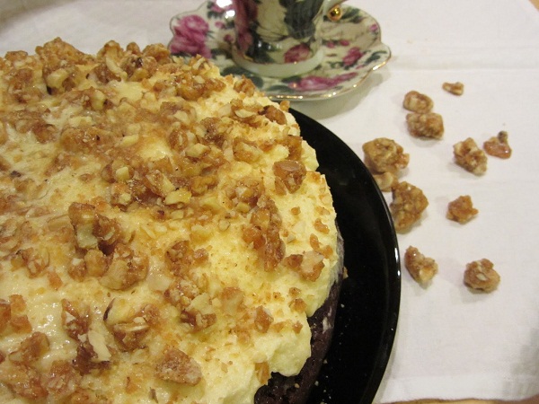 Αδειάζουμε σε αλουμινόχαρτο και περιμένουμε να σφίξει. Αφού κρυώσει, κόβονται μικρά κομμάτια και αλέθονται. “(Δεν είχα καρύδια, άρα άλεσα φουντούκια.