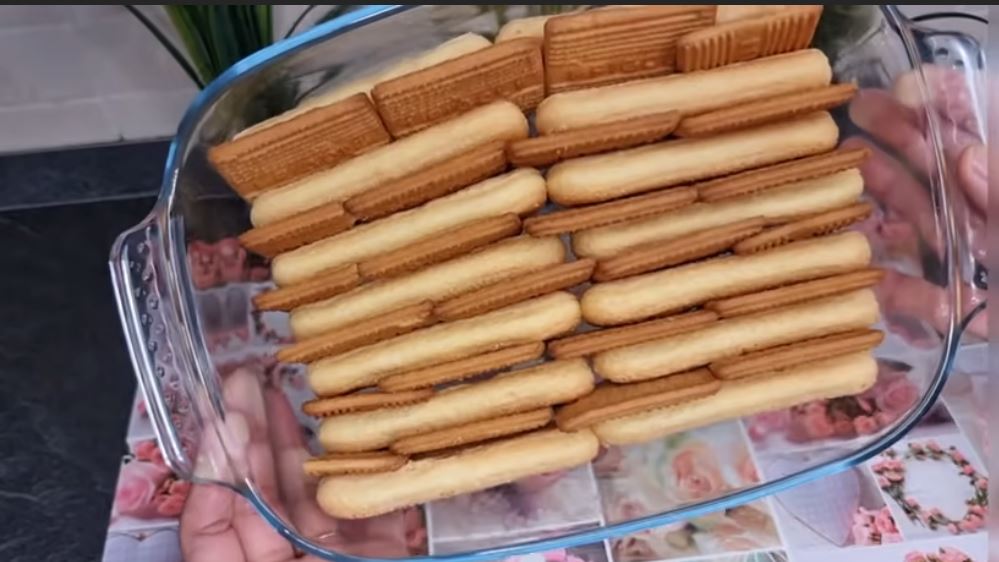 Σε ένα πυρέξ 35χ25 εκ στρώνουμε στη βάση τα σαβαγιάρ και τα μπισκότα πτι-μπερ σειρά παρα σειρα αφού πρώτα το σαβαγιάρ τα βουτήξουμε στο γάλα όπως βλέπετε στη φωτογραφία.