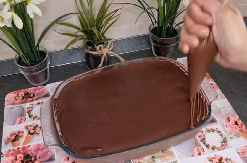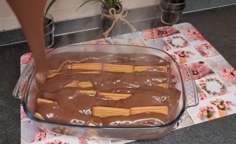 Αδειάζουμε τη ζεστή κρέμα να καλύψει τα μπισκότα πλήρως,