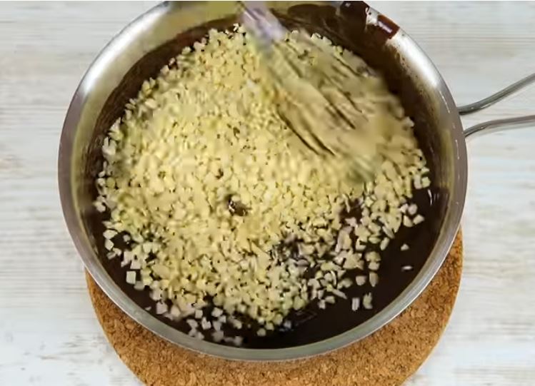 Ανακατεύουμε πολύ καλά μέχρι να λιώσει και στη συνέχεια προσθέτουμε τα τριμμένα φουντούκια.