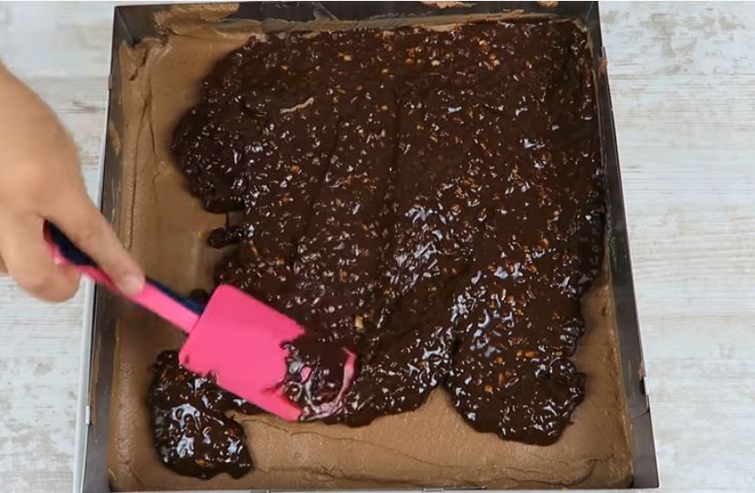 Βάζουμε αυτό το μείγμα στη φόρμα και απλώνουμε πάρα πολύ καλά σε όλη την επιφάνεια.