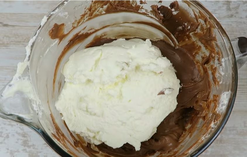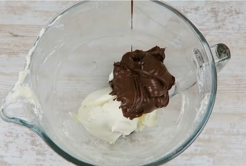 Bάζουμε στον κάδο του μίξερ το μασκαρπόνε και τη nutella και χτυπάμε σε μέτρια ταχύτητα μέχρι να ενωθούν αυτά τα δύο υλικά.