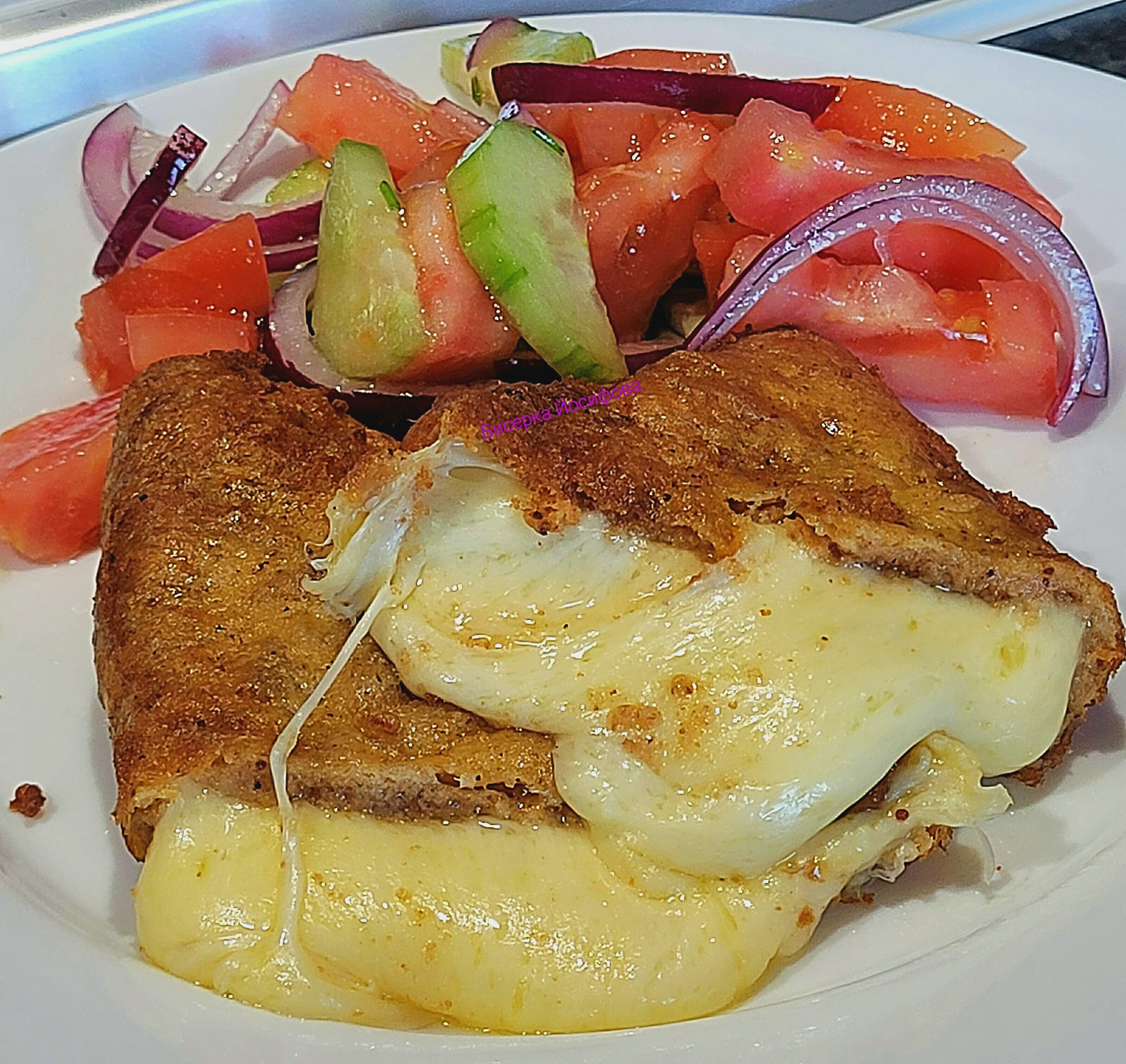 Το πρωί μούλιασα το κίτρινο τυρί σε κρύο νερό, το κύλησα σε αλεύρι, το βούτηξα σε χτυπημένα αυγά και το κύλησα όμορφα σε τριμμένη φρυγανιά. Άφησα τα κομμάτια στο ψυγείο για 1 λωρα. Τώρα τα έλιωσα σε χτυπημένο αυγό και τα τηγάνισα σε καυτό λάδι μέχρι να ροδοκοκκινίσουν. Σερβιρα με μία αγγουροντομάτα σαλαταντομάτα