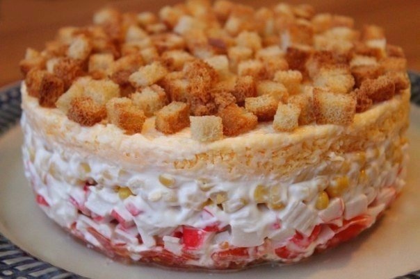 4. Για την τελευταία στρώση, τρίβω το τυρί και το απλώνω πάνω από το καλαμπόκι. αλείφω και αυτή τη στρώση με μαγιονέζα και στολίζω τη σαλάτα με κρουτόν.