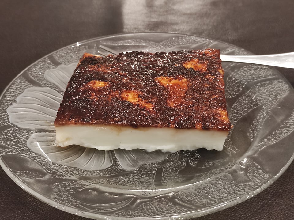 Κόβουμε σε κομμάτια και με μία σπάτουλα αναποδογυρίζουμε το κομμάτι στο πιάτο ώστε να φαίνεται η καμένη πλευρά. Μπορούμε αν θέλουμε και μας αρέσει να πασπαλίσουμε με λίγη κανέλα.