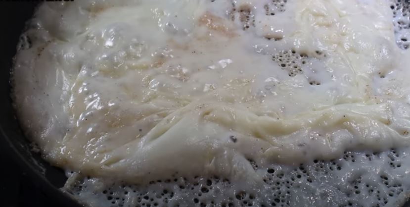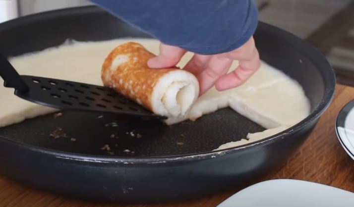 Για να φτιάξετε μια λεπτή και εύκολη στρώση χρησιμοποιήστε τη μισή κρέμα. Κάνουμε το άλλο μισό με τον ίδιο τρόπο σε άλλο τηγανι. Αν δεν πρόκειται να τυλιξετε το γλυκό, ετοιμάστε ολόκληρη τη δόση σε ταψί ή φόρμα.