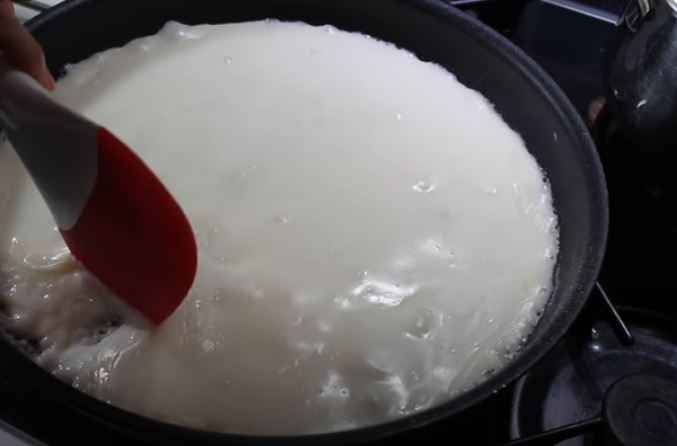 Ρίχνουμε την υπόλοιπη κρέμα από πάνω, λειαίνουμε και μαγειρεύουμε για λίγα λεπτά (13′) ακόμα χωρίς να ανακατεύουμε.