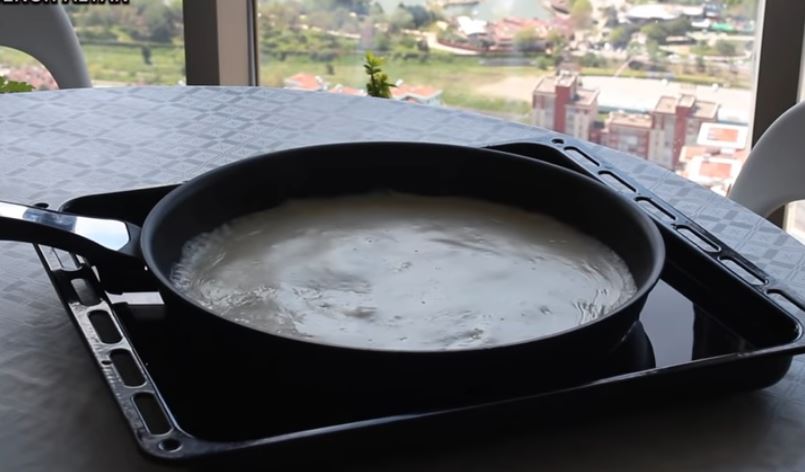 Ρίχνουμε ένα μικρό μέρος της κρέμας πάνω στην καραμέλα, απλώνουμε καλά σε όλο τον πάτο. Περιμένετε λίγα λεπτά (10′) να σχηματιστούν φυσαλίδες στην επιφάνεια της κρέμας.