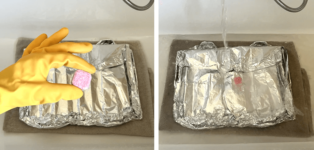 Προσθέστε μια ταμπλέτα πλυντηρίου πιάτων πάνω από κάθε τυλιγμένο αντικείμενο και καλύψτε τα πάντα με ζεστό νερό.