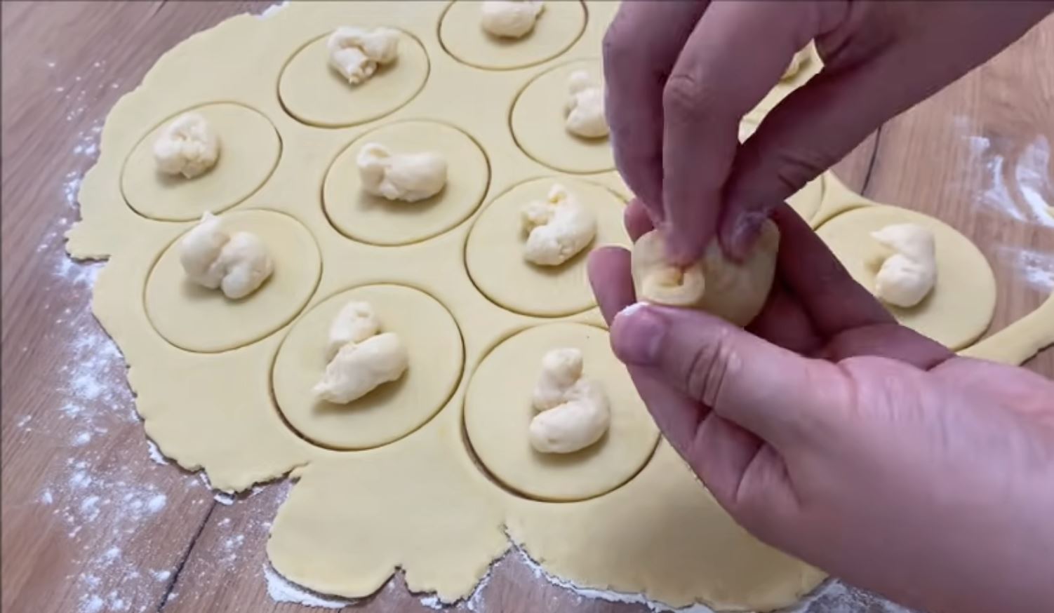 Αλευρώνουμε τον πάγκο μας βάζουμε τη ζύμη και την ανοίγουμε με ένα πλάστη σε ένα φύλλο πάχους 1 mm με ένα κουπάτ κόβουμε κυκλάκια και πάνω σε κάθε κυκλάκι με την τσάντα ζαχαροπλαστικής βάζουμε μία μικρή ποσότητα από την κρέμα στη συνέχεια και το κλείνουμε σαν πουγκί και το πλάθουμε
