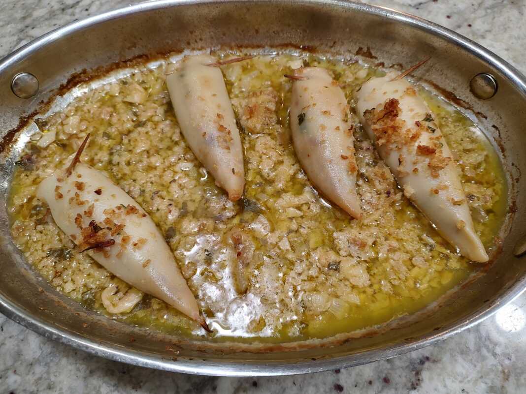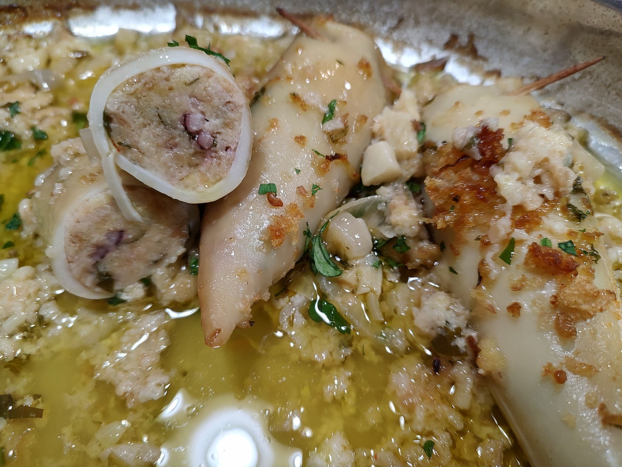 Ψιλοκόβουμε τα πλοκάμια και τα πτερύγια από τα καλαμάρια και κρατάμε τα σώματα (τις φούσκες) ολόκληρα για να τα γεμίσουμε στη συνέχεια.